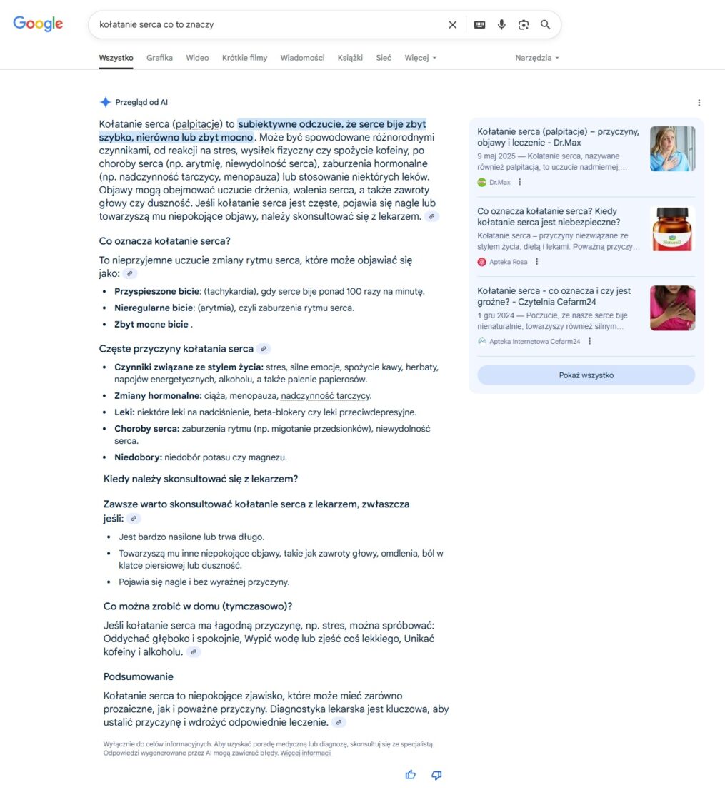 Wyobraź sobie, że bliska Ci osoba skarży się na kołatanie serca. Intuicja może podpowiedzieć zasięgnięcie szybkiej porady w Google. Oto jak obecnie może wyglądać strona wyników wyszukiwania.
